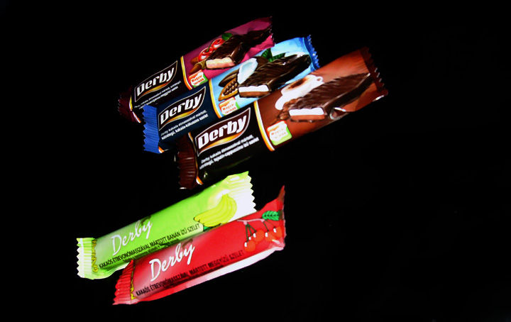 Hajdanában Derby név alatt borotvahab, ömlesztett sajt, keksz is létezett, napjainkban étbevonóval mártott mindenízű szeletek kaphatóak a Bonbonetti Kft. jóvoltából. Most ha nem is futja egy átfogó tesztre, egy befogóra talán mégis.       Édességért nyavalygó gyerek száját és emésztőrendszerét, majd alsónadrágját befogó, Mme Tussaud panoptikumában is helyt álló csokoládészurrogátumok ezek a szeletek, a teszt alanyai, a képen fentről lefelé haladva valamennyire láthatóak, előbb a kétrétegűek, mandulamarcipános-meggyízű, kakaós-alkálibohócos és a tejszíneskávé-kaftánpelyhes változatok, majd a két egyrétegű, úgymint banán illetve meggyízű szeletek.   A legelső random zsebből húzott darab a tejszínes kávézaccmutatványos típus, amire valami bohókás ötlettől vezéreltetve egy "a kép csak illusztráció" jellegű cappucino termékfotót pingáltak, mert a festék manapság filléres dolog, a csokoládé viszont drága.   El is érkeztünk mondanivalónk lényegéhez, a csokoládé problematikájához. Csokoládéallergiások nyugodtan lakmározhatnak ezekből a szeletekből, az étmassza, a bevonó, a burok vagy minek nevezzem, szóval ez a legalább 20%-os arányban jelen lévő szintetikus organizmus se ízben, se illatban, se tapintásban, se kémiai reakciókban, se fizikai paraméterekben nem emlékeztet a csokoládéra. Ez szar! Hosszas tapogatás után is legfeljebb barna gyurma, viaszgyertya állagú, íztelen, szagtalan anyag, egyfajta szilikonfaggyú. Ha átrágjuk magunkat ezen a másodlagos burkolaton, egy igen édes, lisztes állagú szelethez érkezünk, mely különböző íznyomokkal van átitatva.   A kávés, vagyis cappucinos szeletben az édesszájúaknak is eltúlzott cukrosság mögül előbukkan némi kávéíz, a többször átfőzött senseo kávépárna képzelt szopogatására emlékeztető szinten. Aki ilyen csokoládét kénytelen gyermekként enni, nem fogja kívánni átélni a retro élményét. Talán azért is, mert ilyen borzalmat nehéz lesz tudatosan előállítani, megismételni pár évtized múlva, egyrészt a technológia kérlelhetetlen fejlődése miatt, másrészt mivel gyaníthatóan addigra védett életformának fogják nyilvánítani a most még ismeretlen eredetű, rendeltetésű barna burkolatot a szeleteken.   Sikeresen legyűrtük az első akadályt, a következő véletlenül kiválasztott egyed (érted, hogy egyed!), a mandulamarcipános-meggyes kombináció. Egész jó, meggyes íz, de inkább süti íz, kezdjük megszokni a barna burok ízetlenségét, a marcipán valamelyest hasonlít a búcsús kekszrudak ízére. Ehető, jobb mint amire számítottam.   A harmadik versenyző a képen számomra az imént kakaós-alkálibohócosnak látszó, valójában kakaós-kókuszos szelet, ami inkább rumos beütésekkel emlékeztet ugyan a kókuszra, de ne számítson senki a Bounty naturális kókuszosságára, ez inkább a rumos kókuszgolyóban lévő kókuszkrém ízvilága, de nem annyira sikerült jól, mint a meggyes jószág.   Az egyszerű szeletek egy tizessel olcsóbbak mint a nagy testvérek, a meggyes felemás érzéseket szül ugyan a rajta lévő barna szar miatt, kicsit gumis az állaga, de jobb, összehasonlíthatatlanul jobb, mint a duplarétegűek bármelyike. Minek bonyolítani ugye, amit elbaszunk? Nemes egyszerűség, kisebb anyagi kár jellemzi az olcsóbb szeletkéket.   A banános marad a végére és megnyeri a versenyt, a töltet gumissága a habosított banándesszertekre emlékeztet, jó műbanán íz, olyan amilyennek lennie kell, boldog vegyészeti produktum, nem árt, nem használ, annyit ér, amennyibe kerül.   Kontroll teszt is készült a termékek másodpéldányaival, ezúttal a kóstolás előtt hűtőben tároltuk őket, hátha kedvezően befolyásolja az ízélményt a hőfok. Azonban a szar hűtve is szar maradt, a bevonó hidegen még annyira sem oldódik nyálban mint eddig, a megcsócsált ragacsos gombócot nem sikerült lenyelni, a kukában végezte.   Röviden összegezve a teszt tanulságait, a bevonómasszás átverés csillaga lassan leáldoz, egyszer meg lehet etetni az emberekkel a szart, azaz egyszer sem. Komolyabb alapkutatások szükségeltetnek a lenyelhető típusú csokoládépótlószerek kifejlesztése érdekében. Nagyon drukkolunk, hogy sikerüljön!